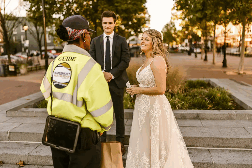 Ashley and Andrew Powell surprised an intimate group of friends and family by hosting a wedding outside on Nov. 16, 2024, in Fells Point, a waterfront neighborhood in Baltimore. The couple privately married a year prior and later wanted to publicly exchange vows in the place where they first expressed their love for one another. What the pair never expected was a park guide to witness their entire ceremony from afar.