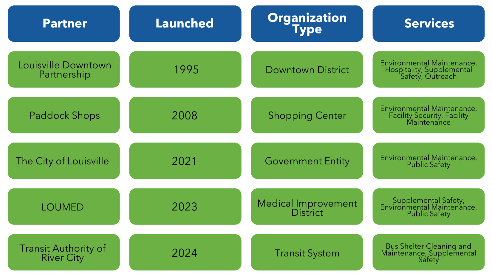 Since 1995, Block by Block has grown from one Ambassador Program to more than 150 Ambassador Programs nationwide. Our very first customer, Louisville Downtown Partnership, is still our customer today. As we have found success throughout the years, we have always reinvested it into delivering better operational efficiencies to our teams in the field and to our customers.