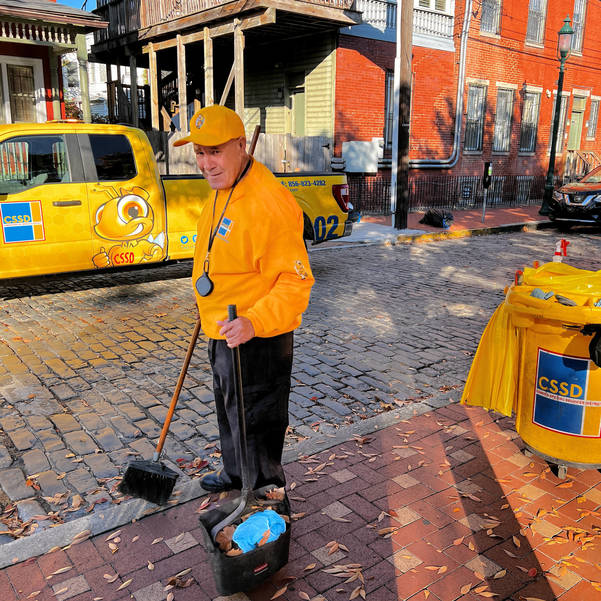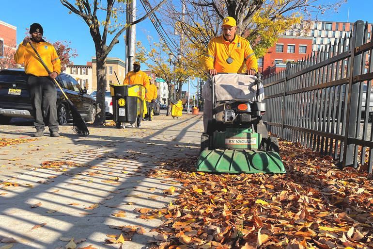 Near Third and Market Streets, Johnny Diaz walked behind one of three of the special services district’s “Billy Goats” – a large, wheeled vacuum cleaner that sucks up street litter, but comes into especially heavy use in the autumn to collect leaves into their giant bags.